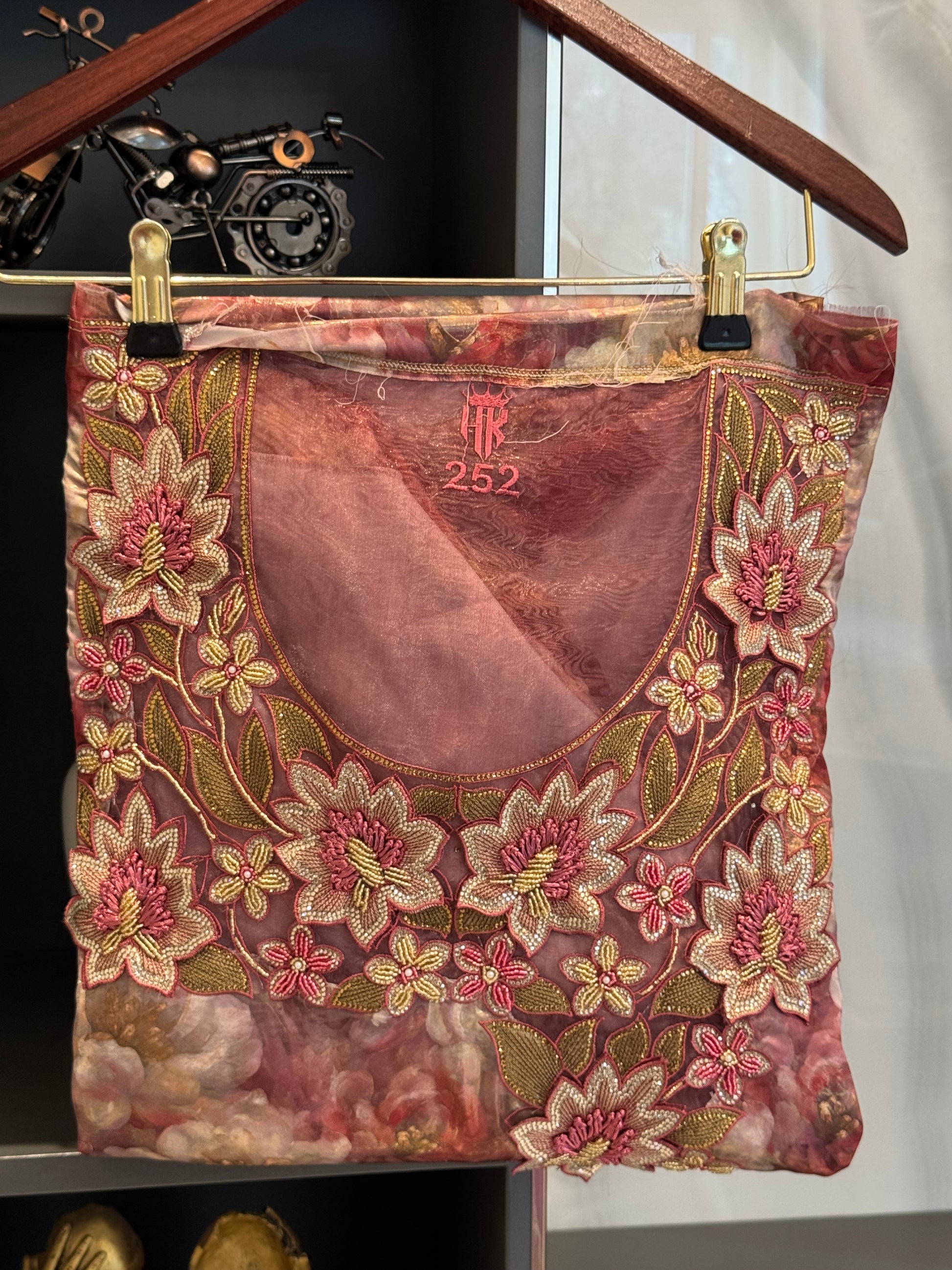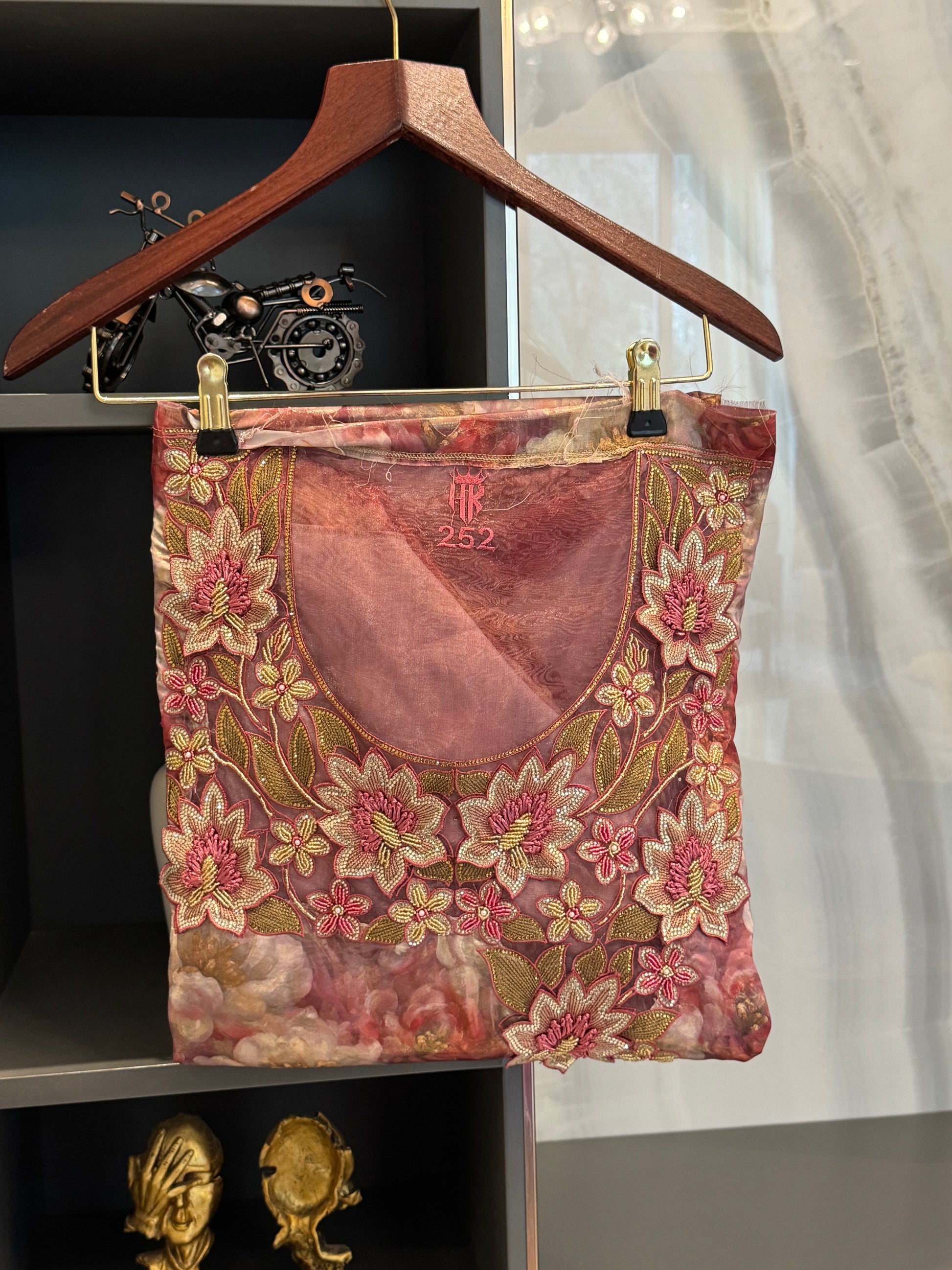 Crafted from luxurious silk, the Blushingly Pink is a statement textile that feels like wearable art. The fabric carries a luminous, oil-painted finish—softly marbled florals layered with depth and movement—giving it the appearance of a hand-brushed canvas. Its surface is naturally glossy and highly reflective, catching the light with every shift to create an elegant, fluid shimmer.