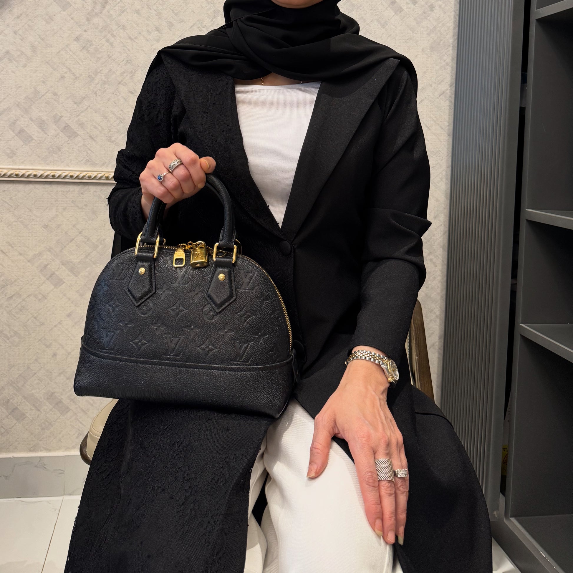A timeless black abaya crafted from luxurious crepe fabric and detailed with delicate lace panels for a touch of texture and sophistication. The design features a structured blazer-inspired cut with covered buttons and a smooth satin-like finish on the upper bodice, blending modesty with modern tailoring. Perfect for both formal and casual settings, it pairs effortlessly with white or neutral tones for a polished, refined look.