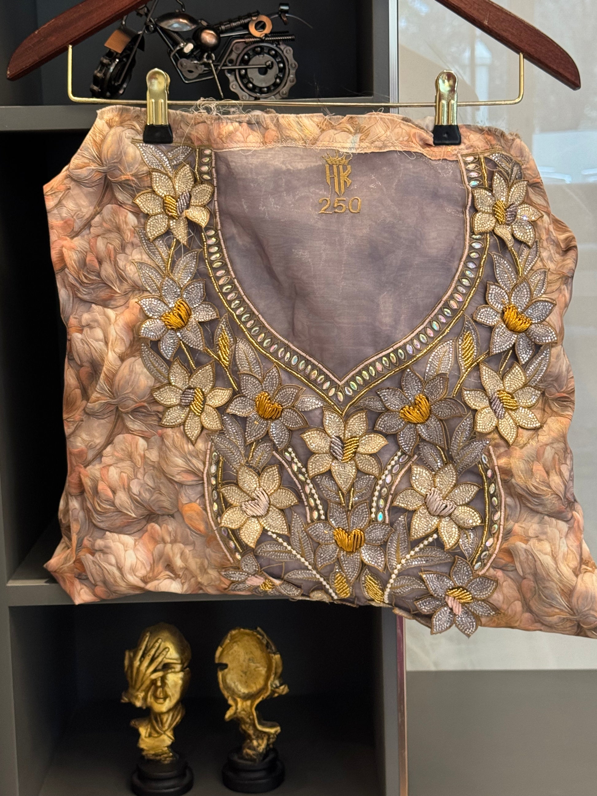 Delicate floral embroidery frames the panel, adding texture and dimension while enhancing the painterly effect beneath. The result is a refined balance between artistry and craftsmanship: rich, expressive, and unmistakably elegant. Ideal for elevated designs where detail, shine, and visual poetry matter.
