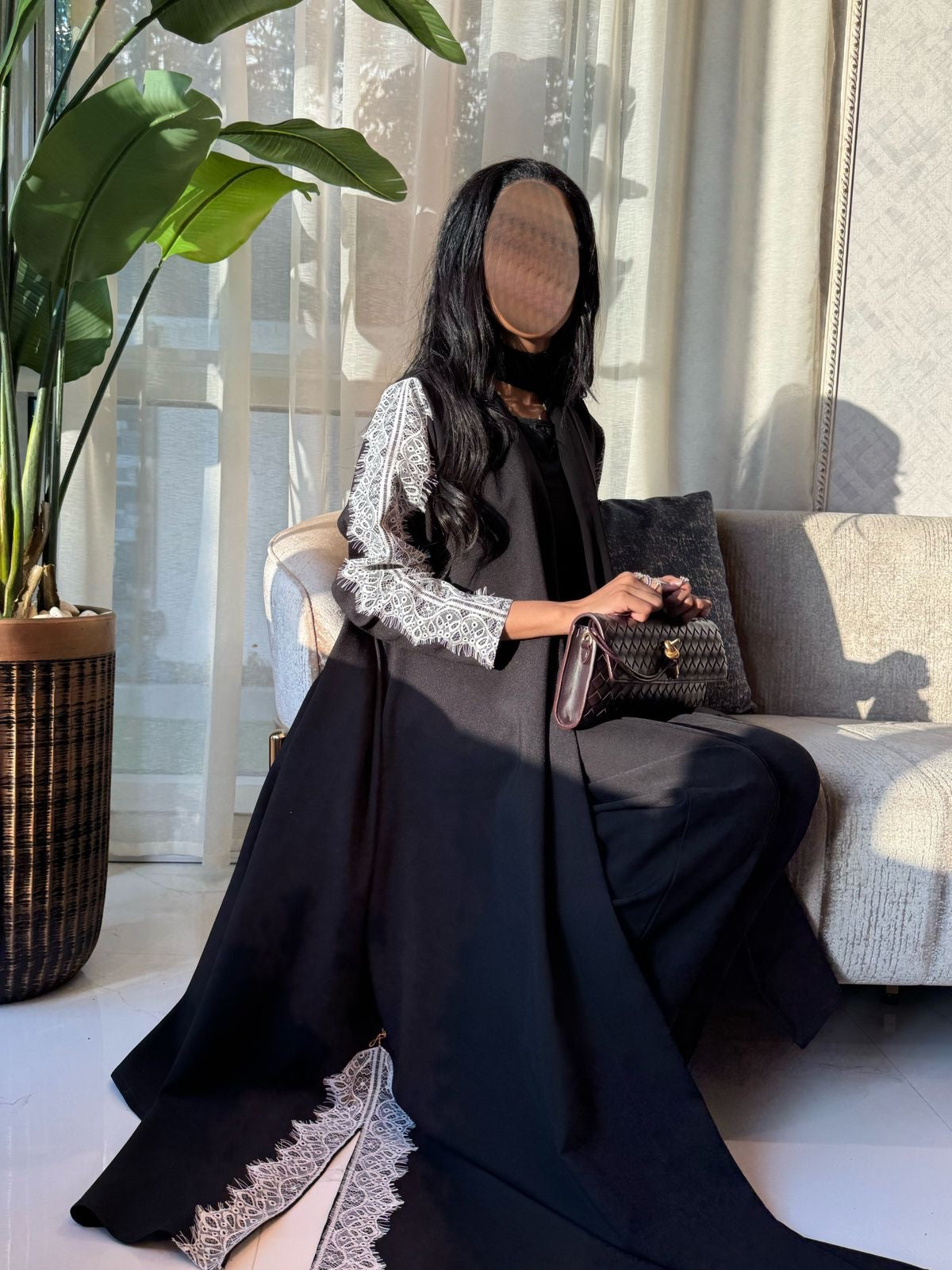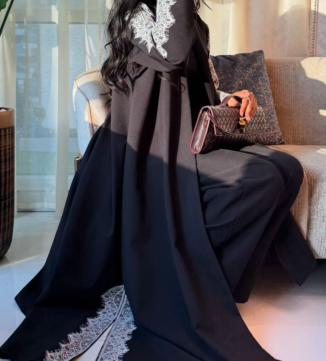 This abaya is designed with a strong yet fluid silhouette, crafted from smooth, structured fabric that flows effortlessly with movement. Delicate lace detailing is placed with intention, adding contrast and refinement without overpowering the design. The cut creates natural volume and elegance, giving the piece a dramatic yet wearable presence. Timeless in black and elevated through texture and structure, this abaya is made for women who appreciate understated luxury and modern couture.