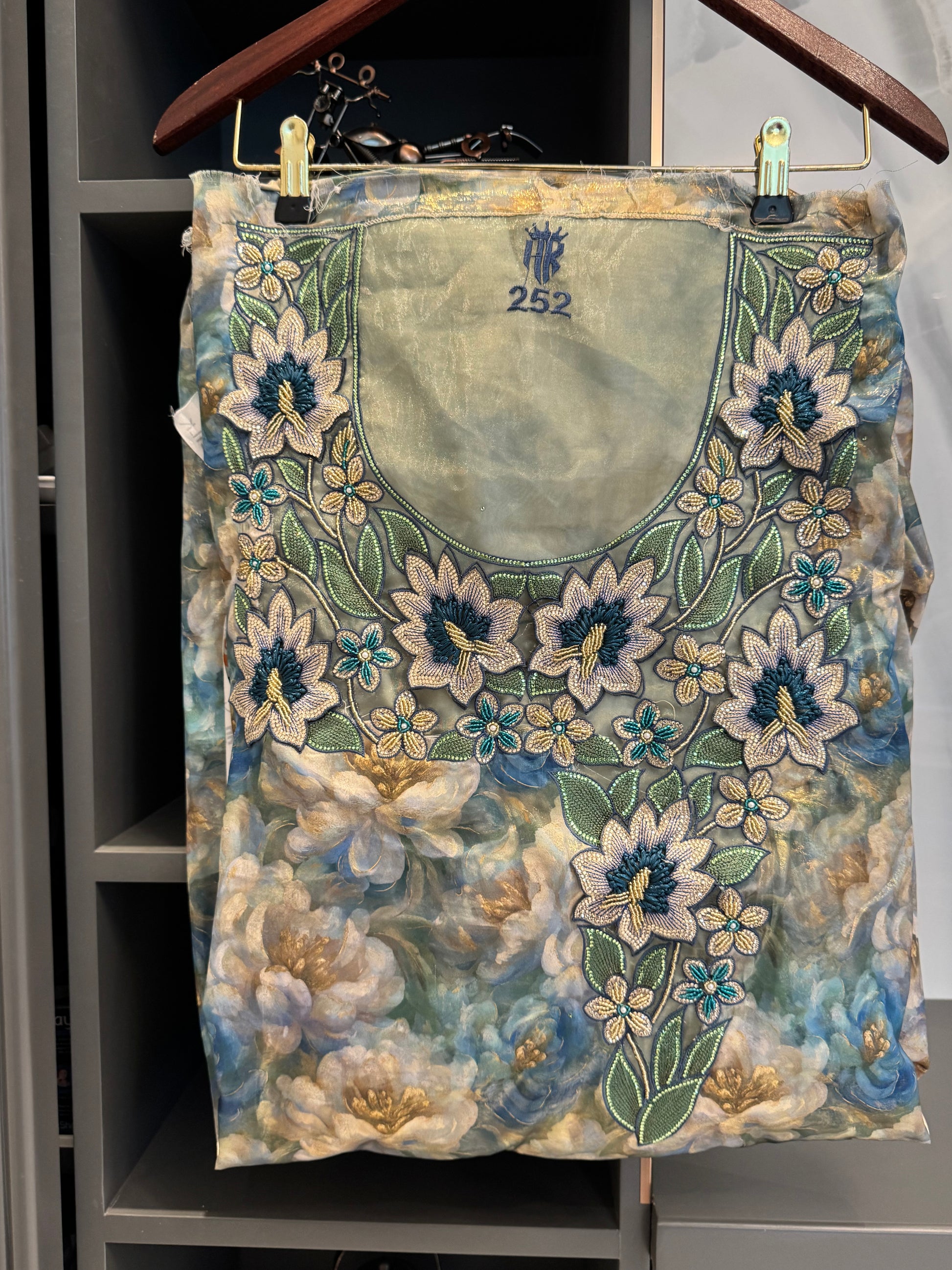 Delicate floral embroidery frames the panel, adding texture and dimension while enhancing the painterly effect beneath. The result is a refined balance between artistry and craftsmanship: rich, expressive, and unmistakably elegant. Ideal for elevated designs where detail, shine, and visual poetry matter.